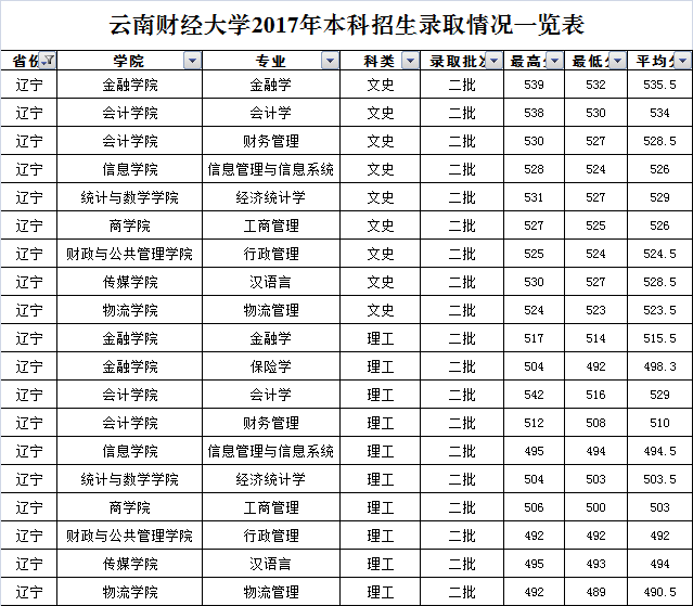 云南財(cái)經(jīng)大學(xué)2017年遼寧省錄取情況一覽表