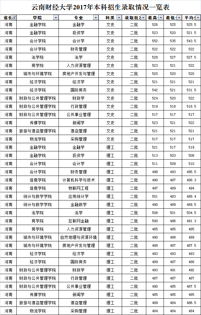 云南財(cái)經(jīng)大學(xué)2017年河南省錄取情況一覽表