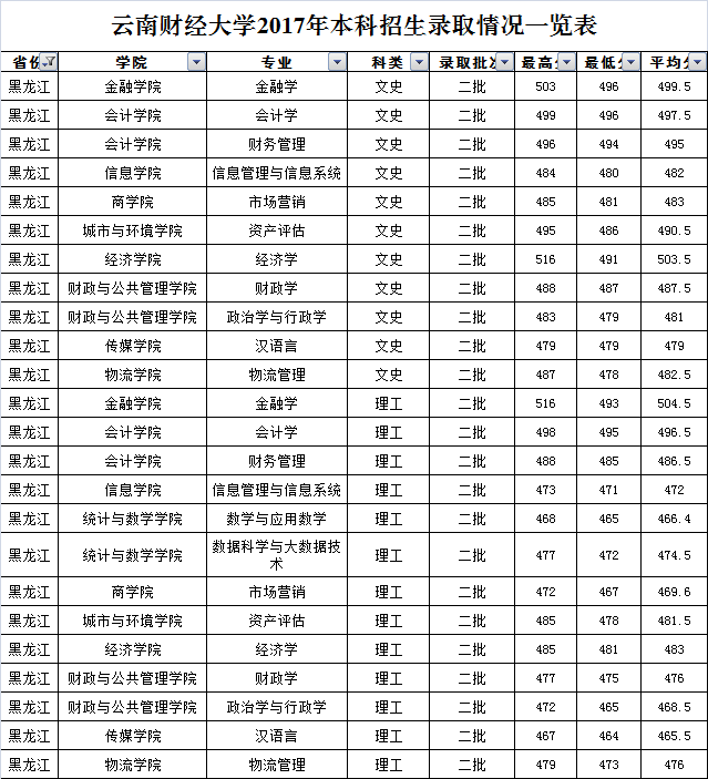 云南財(cái)經(jīng)大學(xué)2017年黑龍江省錄取情況一覽表