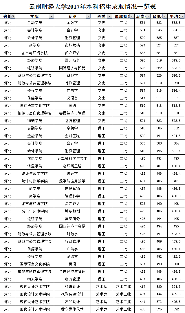云南財經(jīng)大學(xué)2017年河北省錄取情況一覽表