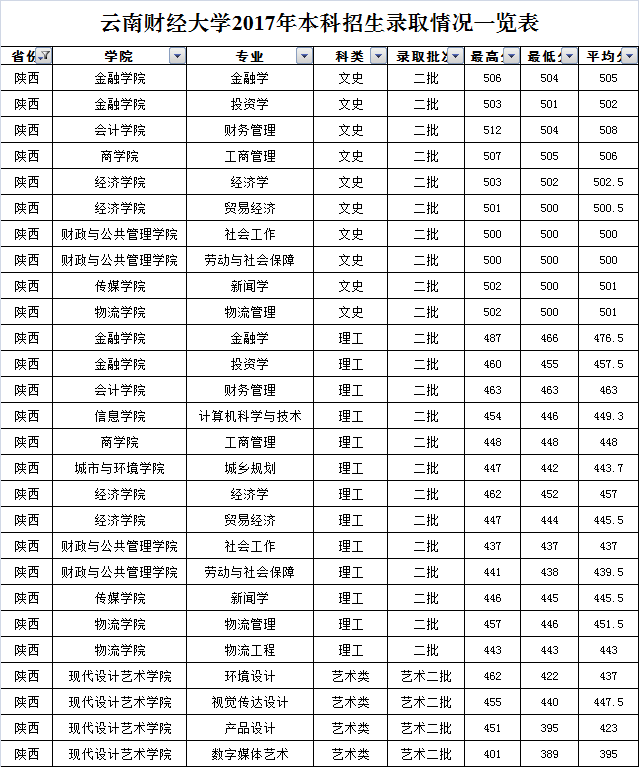 云南財經(jīng)大學2017年陜西省錄取情況一覽表