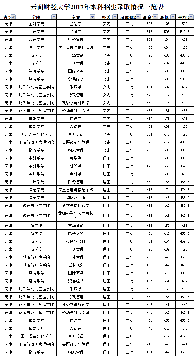 云南財經(jīng)大學2017年天津市錄取情況一覽表