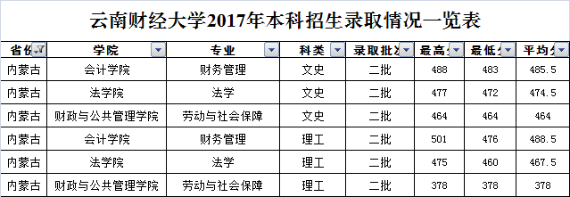 云南財(cái)經(jīng)大學(xué)2017年內(nèi)蒙古自治區(qū)錄取情況一覽表