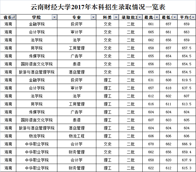 云南財(cái)經(jīng)大學(xué)2017年海南省錄取情況一覽表