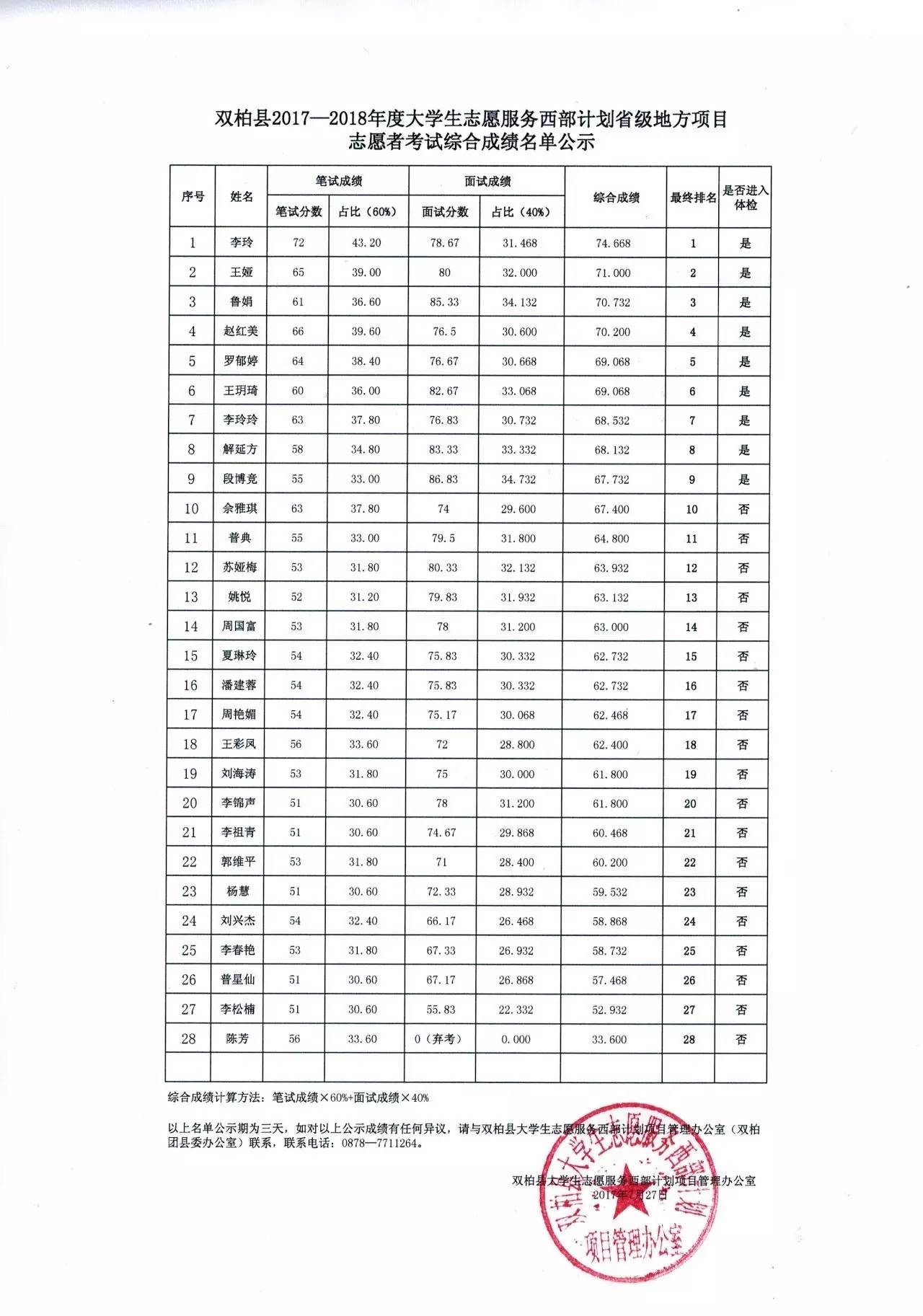 請進(jìn)入體檢的考生于2017年7月31日上午8:00攜帶個(gè)人有效身份證件及小一寸近期免冠證件照前往雙柏縣人民醫(yī)院住院部前集中,由項(xiàng)目辦工作人員組織統(tǒng)一體檢。體檢前請勿進(jìn)食,自備體檢費(fèi)用。若存在體檢不合格或近期有在崗志愿者離崗的情況,項(xiàng)目辦將根據(jù)實(shí)際情況進(jìn)行補(bǔ)錄。現(xiàn)將綜合成績排名及進(jìn)入體檢人員名單公示如下,公示名單期為三天(2017年7月28日-2017年7月30日),如有異議,請向雙柏縣大學(xué)生志愿服務(wù)西部計(jì)劃項(xiàng)目管理辦公室(雙柏團(tuán)縣委辦公室)反映。