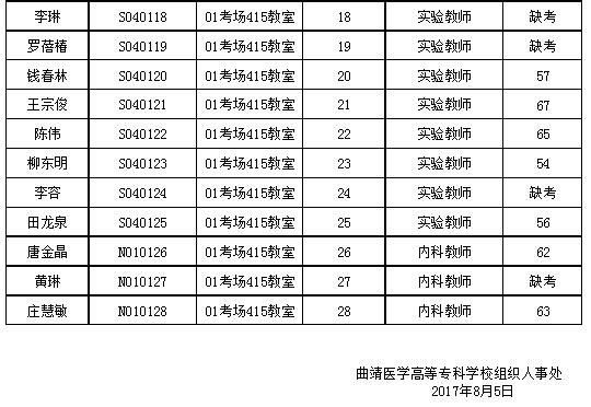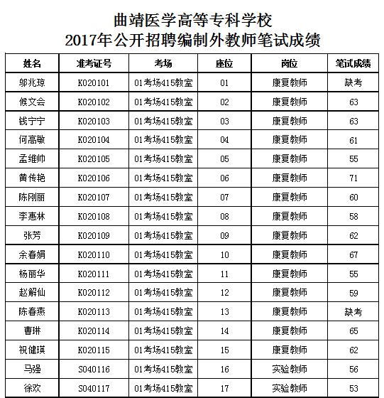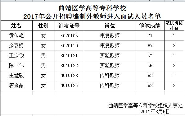 根據(jù)《曲靖醫(yī)學高等??茖W校2017年公開招聘編制外教師公告》筆試工作已結(jié)束?,F(xiàn)將筆試成績及進入面試人員名單公布如下: