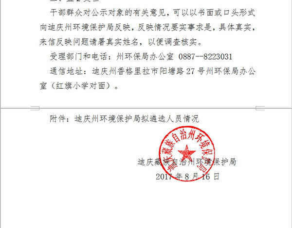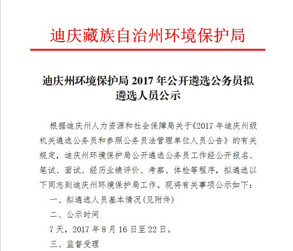 迪慶州環(huán)境保護局2017年公開遴選公務(wù)員擬遴選人員公示