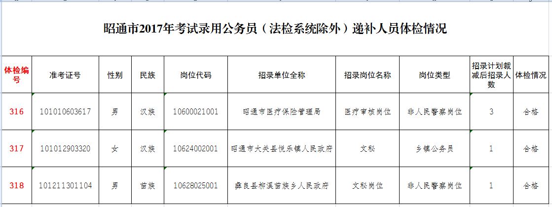 昭通市2017年考試錄用公務員(非法檢)遞補人員體檢情況