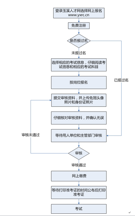 網(wǎng)絡(luò)報名的大致流程為:登錄玉溪人才網(wǎng)→網(wǎng)上報名入口→注冊→查看招聘崗位→按崗位報名并填寫報名資料→等待審核→審核通過→網(wǎng)上交費(fèi)(注意查看交費(fèi)狀態(tài),確認(rèn)交費(fèi)成功)→打印筆試準(zhǔn)考證(打印時間在筆試公告內(nèi)另行通知)→參加筆試。