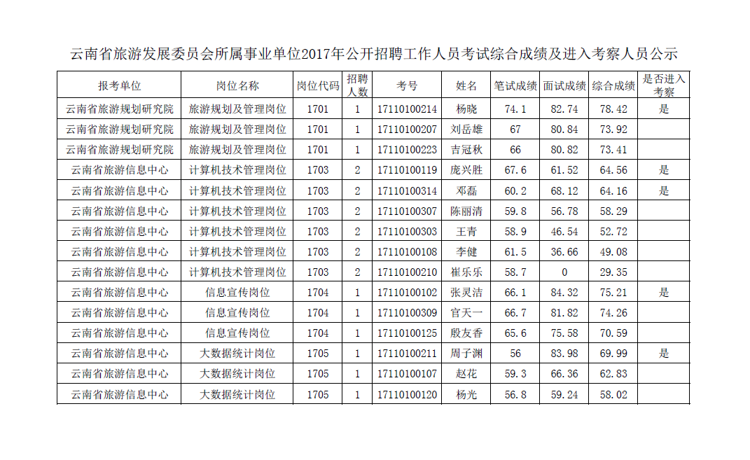 云南省旅游發(fā)展委員會所屬事業(yè)單位 2017年公開招聘工作人員考試綜合成績及進入考察人員公示
