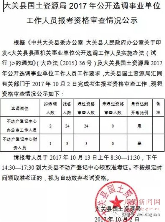 大關(guān)縣國(guó)土資源局2017年選調(diào)人員報(bào)考資格審查情況公示