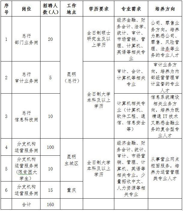 注:為幫助應(yīng)屆畢業(yè)生更快熟悉掌握富滇銀行業(yè)務(wù)、產(chǎn)品和流程,原則上我們將安排錄用至總行部門業(yè)務(wù)崗、審計業(yè)務(wù)崗、信息科技崗的應(yīng)屆畢業(yè)生到分支機構(gòu)鍛煉,鍛煉期滿(總行部門業(yè)務(wù)崗2年、審計業(yè)務(wù)崗1年、信息科技崗3-6個月),考核合格后安排到總行相關(guān)部門工作。