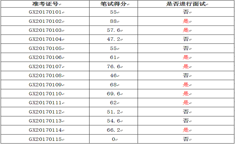 根據(jù)《中共宣威市委辦公室宣威市人民政府辦公室關(guān)于印發(fā)宣威市市直機(jī)關(guān)公開遴選公務(wù)員實(shí)施辦法(試行)的通知》(宣辦發(fā)〔2017〕114號(hào))規(guī)定,按照《中共宣威市委組織部2017年公開遴選公務(wù)員公告》的程序安排,本次公開遴選工作已完成筆試,現(xiàn)將筆試成績(jī)公告如下: