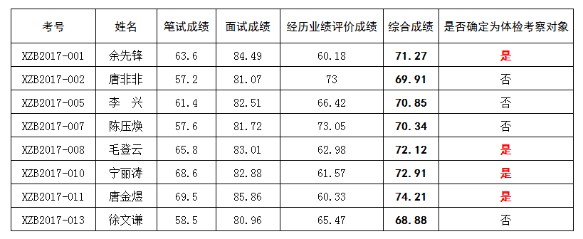 根據(jù)《中共宣威市委辦公室宣威市人民政府辦公室關(guān)于印發(fā)宣威市市直機關(guān)公開遴選公務(wù)員實施辦法(試行)的通知》(宣辦發(fā)〔2017〕114號)規(guī)定,按照規(guī)定的時序安排,本次遴選工作已完成筆試、面試和經(jīng)歷業(yè)績評價工作?,F(xiàn)將考生綜合成績及體檢事項公告如下: