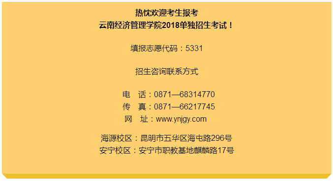 云南經(jīng)濟(jì)管理學(xué)院2018年單獨(dú)招生章程、招生專(zhuān)業(yè)、招生計(jì)劃、考試大綱及實(shí)施方案最終以云南招生考試院公布為準(zhǔn)。