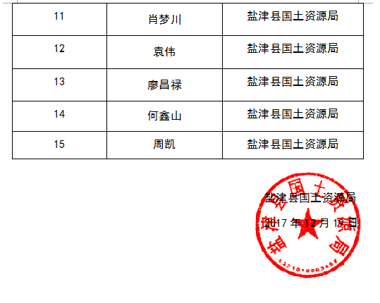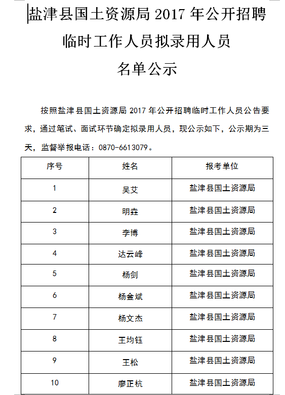 昭通市鹽津國土局2017年招聘臨時工作人員名單公示