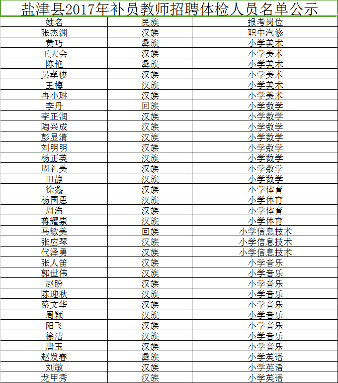 昭通市鹽津縣2017年補(bǔ)員教師招聘體檢人員名單公示