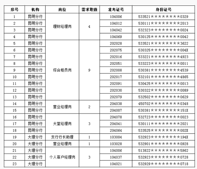 由于大理分行支行行長崗位參考人員綜合成績均未達及格分60分,故本次社會招聘我行取消對大理分行支行行長崗位的招錄,擬錄用以上23人。
