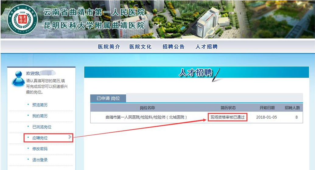 二、所有考生自行登錄招聘系統(tǒng)應(yīng)聘崗位查看現(xiàn)場審核狀態(tài),顯示“現(xiàn)場資格審核已通過”,(如下圖所示)為審核通過,若已參加現(xiàn)場審核并明確審核通過,但系統(tǒng)顯示為未通過,請攜帶材料到曲靖市第一人民醫(yī)院人力資源部再次審核。(2018年1月31日18時(shí)前)