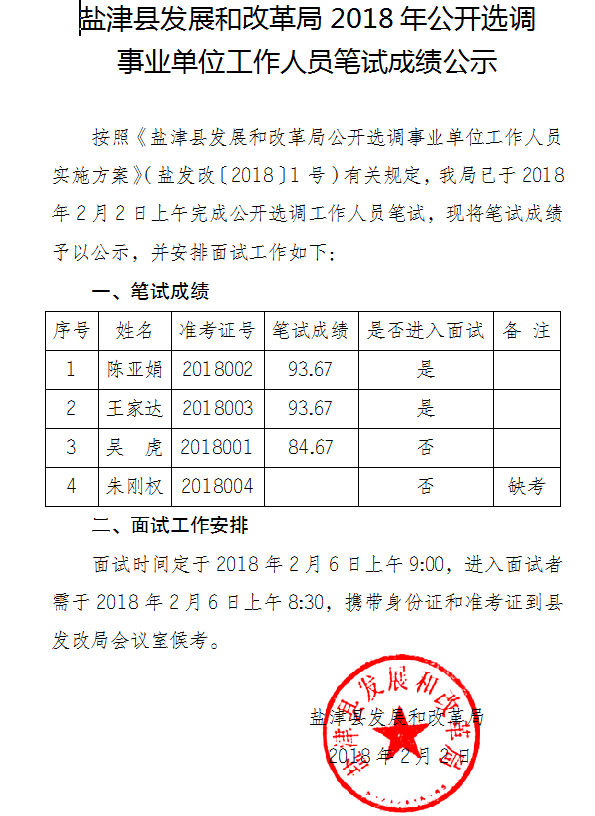 昭通市鹽津發(fā)改局2018年公開選調(diào)事業(yè)人員筆試成績公示