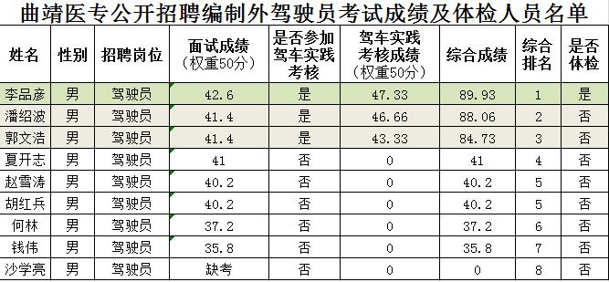 2018年曲靖醫(yī)學(xué)高等專(zhuān)科學(xué)校公開(kāi)招聘編制外駕駛員考試成績(jī)公告