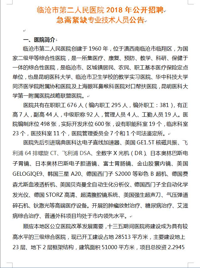 臨滄市第二人民醫(yī)院 2018年公開招聘 急需緊缺專業(yè)技術(shù)人員公告