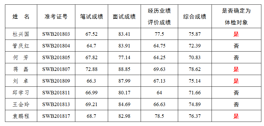根據(jù)《中共宣威市委辦公室 宣威市人民政府辦公室關(guān)于印發(fā)宣威市市直機關(guān)公開遴選公務(wù)員實施辦法(試行)的通知》(宣辦發(fā)〔2017〕114號)規(guī)定,按照《中共宣威市委辦公室2018年公開遴選公務(wù)員公告》的程序要求,本次遴選工作已完成筆試、面試和經(jīng)歷業(yè)績評價工作?,F(xiàn)將考生綜合成績及體檢事項公告如下: