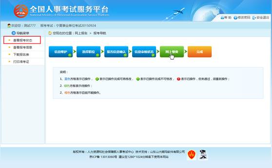 通過(guò)點(diǎn)擊系統(tǒng)導(dǎo)航菜單的“查看報(bào)考狀態(tài)”選項(xiàng),可進(jìn)入查看狀態(tài)頁(yè)面,如下圖