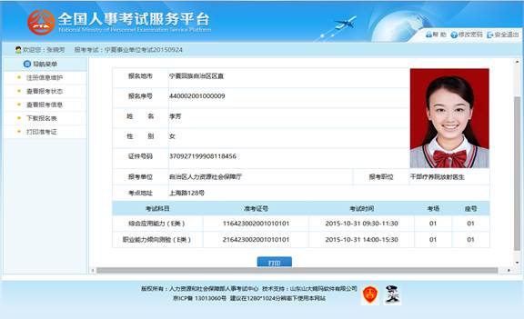 考生可以通過(guò)點(diǎn)擊“查看報(bào)考信息”按鈕,查看考生填寫(xiě)的報(bào)考信息,如下圖所示: