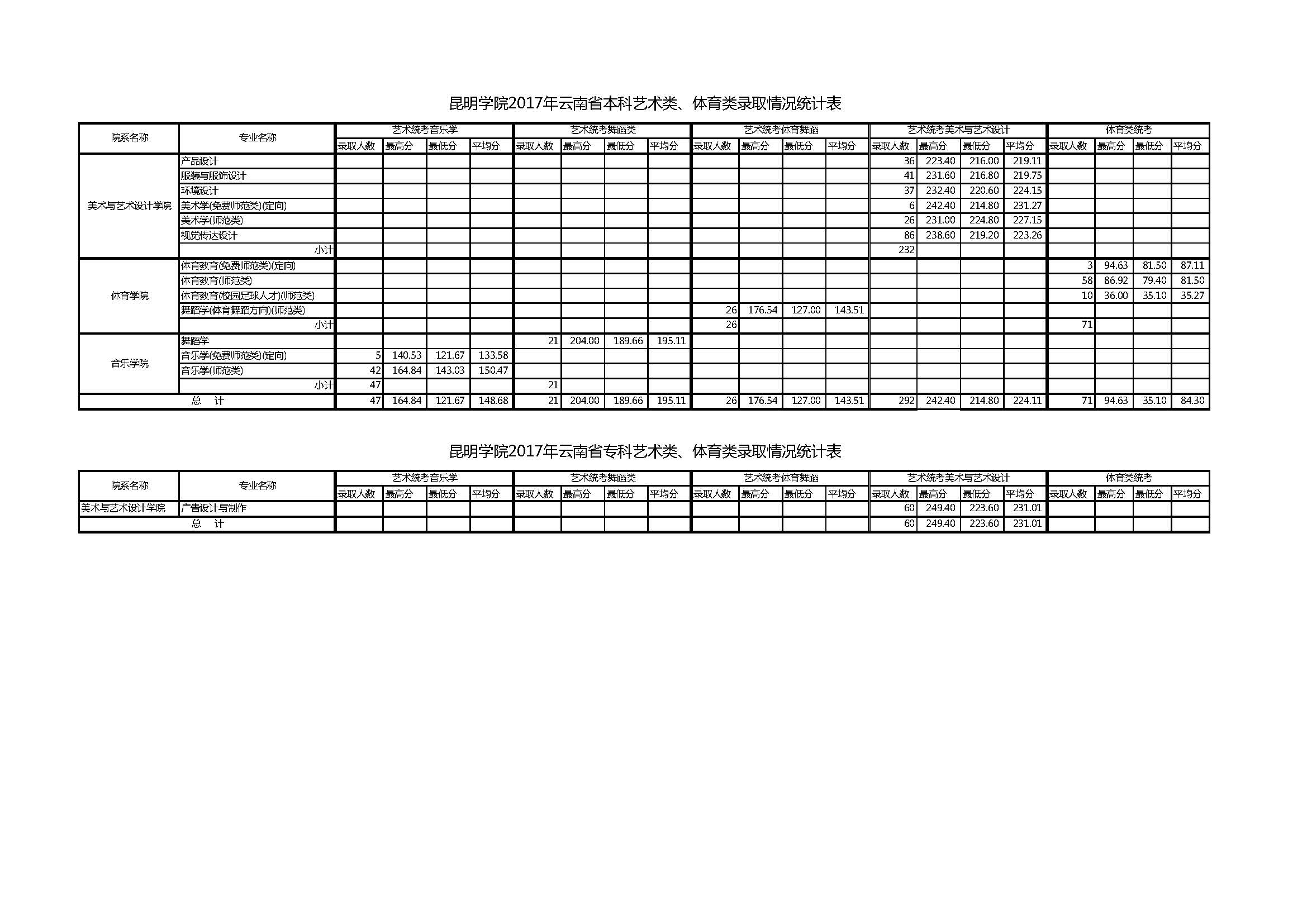 昆明學(xué)院2017年云南省藝術(shù)類、體育類錄取情況統(tǒng)計表