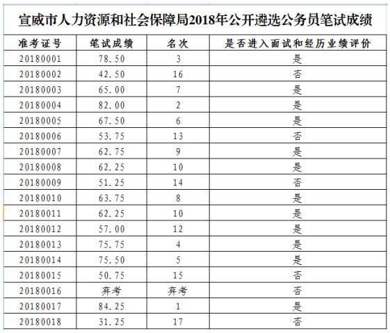 根據(jù)《中共宣威市委辦公室 宣威市人民政府辦公室關(guān)于印發(fā)〈宣威市市直機關(guān)公開遴選公務(wù)員實施辦法(試行)〉的通知》(宣辦發(fā)〔2017〕114號)規(guī)定,按照《宣威市人力資源和社會保障局2018年公開遴選公務(wù)員公告》的程序安排,本次遴選筆試工作現(xiàn)已結(jié)束,現(xiàn)將筆試成績公告如下: