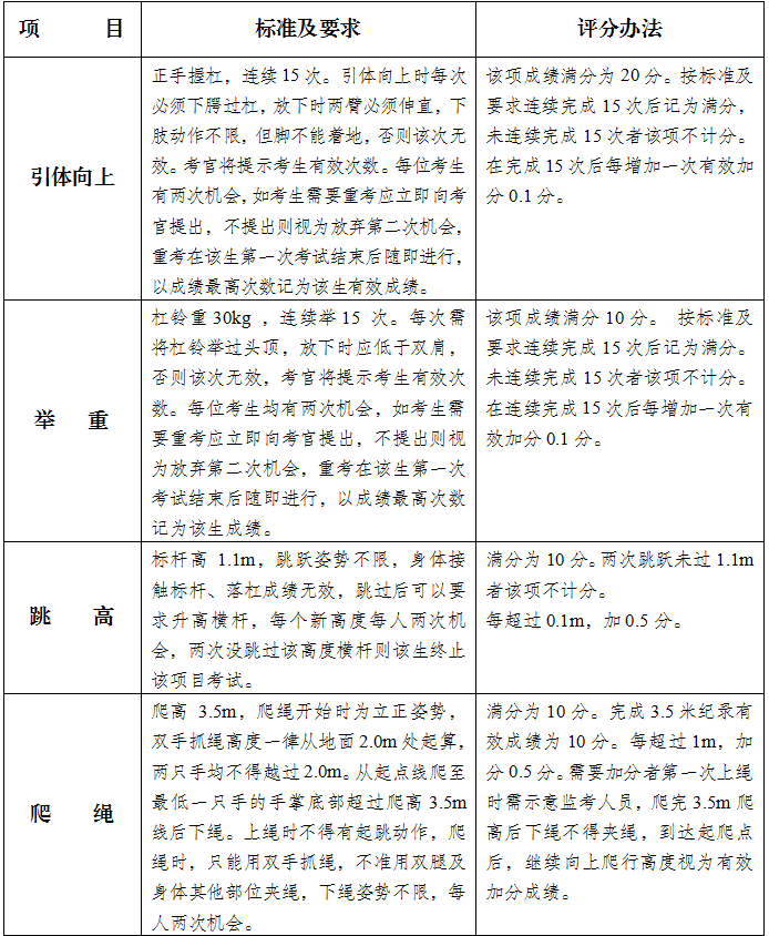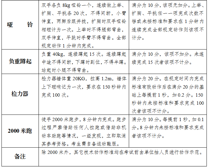 此次體能測試參照國家《礦山救護隊質(zhì)量標準化考核規(guī)范》的礦山救護隊員體能測試標準進行,體能測試內(nèi)容包含:引體向上、舉重、跳高、爬繩、啞鈴、負重蹲起、檢力器、2000米跑共8個測試項。體能測試標準成績滿分為100分,超標準完成有加分。體能測試的最低控制分數(shù)線為70分,低于最低控制分數(shù)線的參試人員不能進入下一步的體檢、考核等錄用程序。評分依據(jù)下面第四條“體能測試要求及評分標準”。若體能測試最終合格人數(shù)達不到此次擬招聘人數(shù),則空缺名額留待下次招聘。
