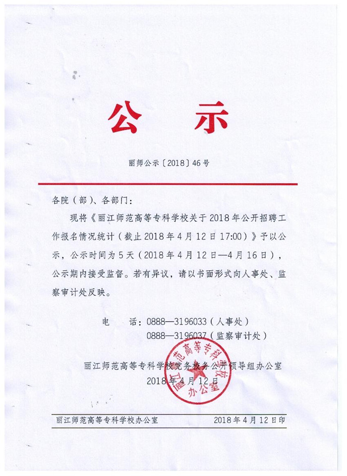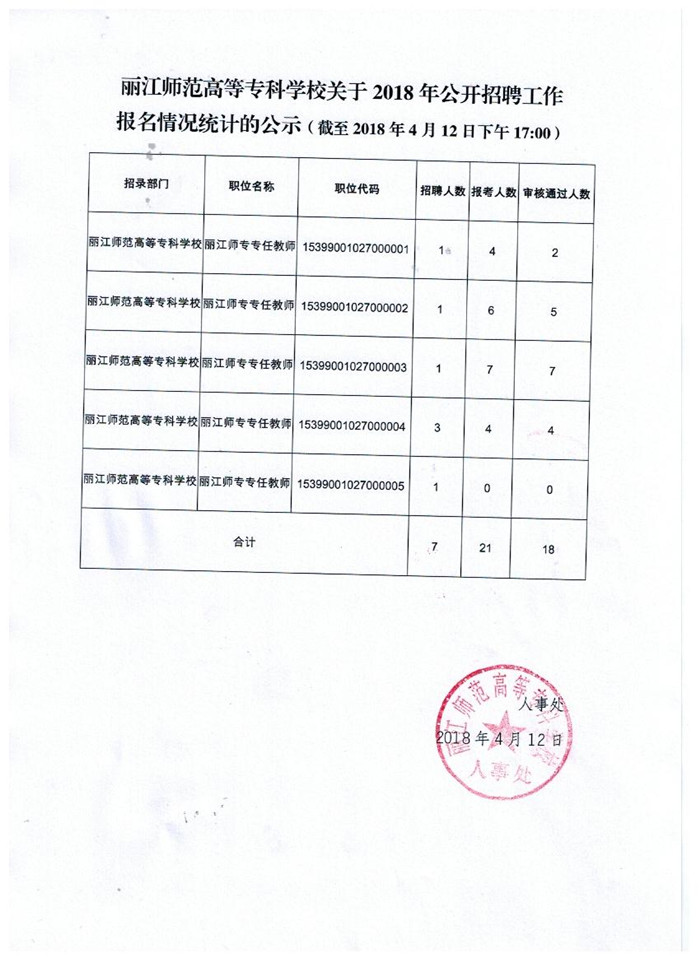 2018年麗江師范高等專科學(xué)校招聘報(bào)名數(shù)據(jù)(截至4月12日17:00)