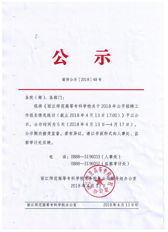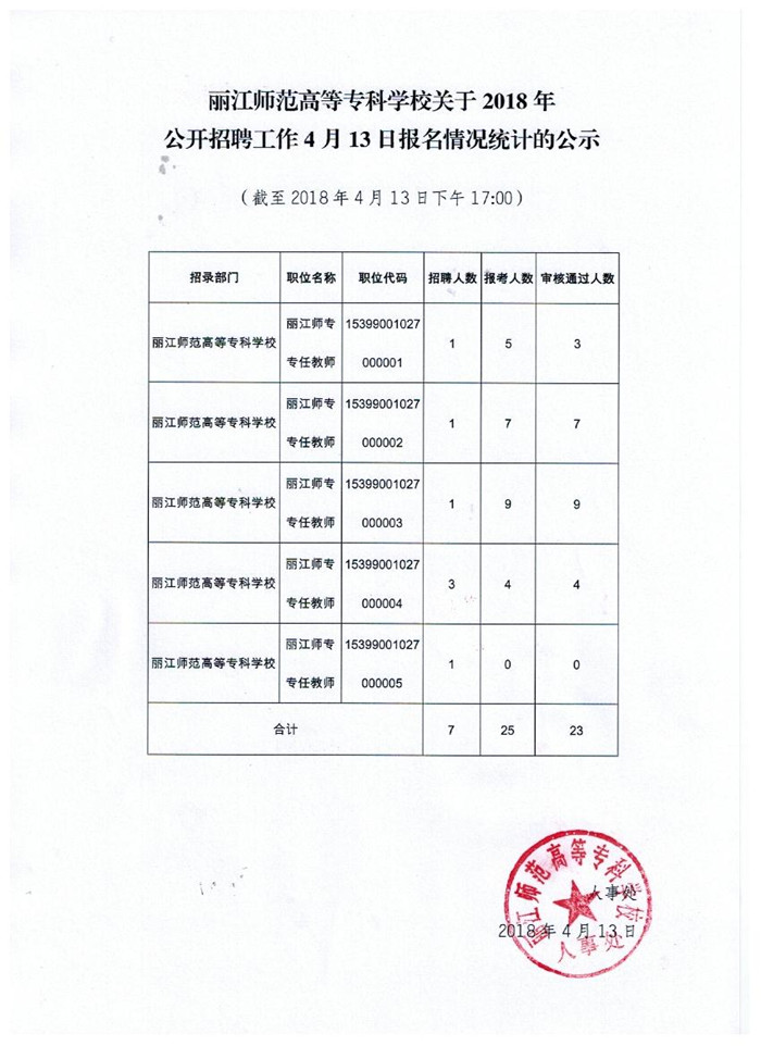 2018年麗江師范高等??茖W(xué)校公開招聘工作報名情況統(tǒng)計公示 (截至2018年4月13日下午17:00)