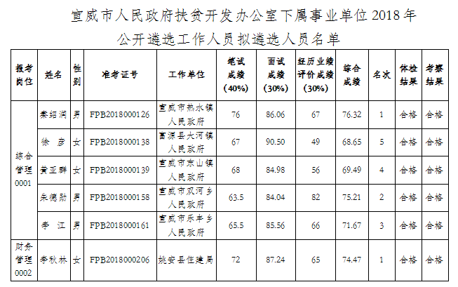 根據(jù)《宣威市市屬事業(yè)單位公開遴選工作人員實施辦法(試行)》(宣辦發(fā)〔2017〕115號)規(guī)定,按照《宣威市人民政府扶貧開發(fā)辦公室下屬事業(yè)單位2018年公開遴選工作人員公告》的程序安排,本次遴選筆試、面試、經(jīng)歷業(yè)績評價、體檢和組織考察工作已經(jīng)結(jié)束,現(xiàn)將擬遴選人員公示如下,公示期為7天(2018年4月20日至2018年4月26日)。