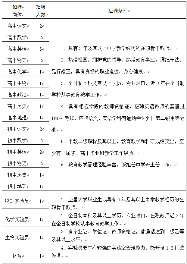 注:男教師年齡在40歲以下,女教師年齡在35歲以下(體育教師年齡在30歲以下)。滿足以下條件之一并取得相關(guān)證件者,年齡可適當(dāng)放寬,同等條件下予以優(yōu)先考慮。