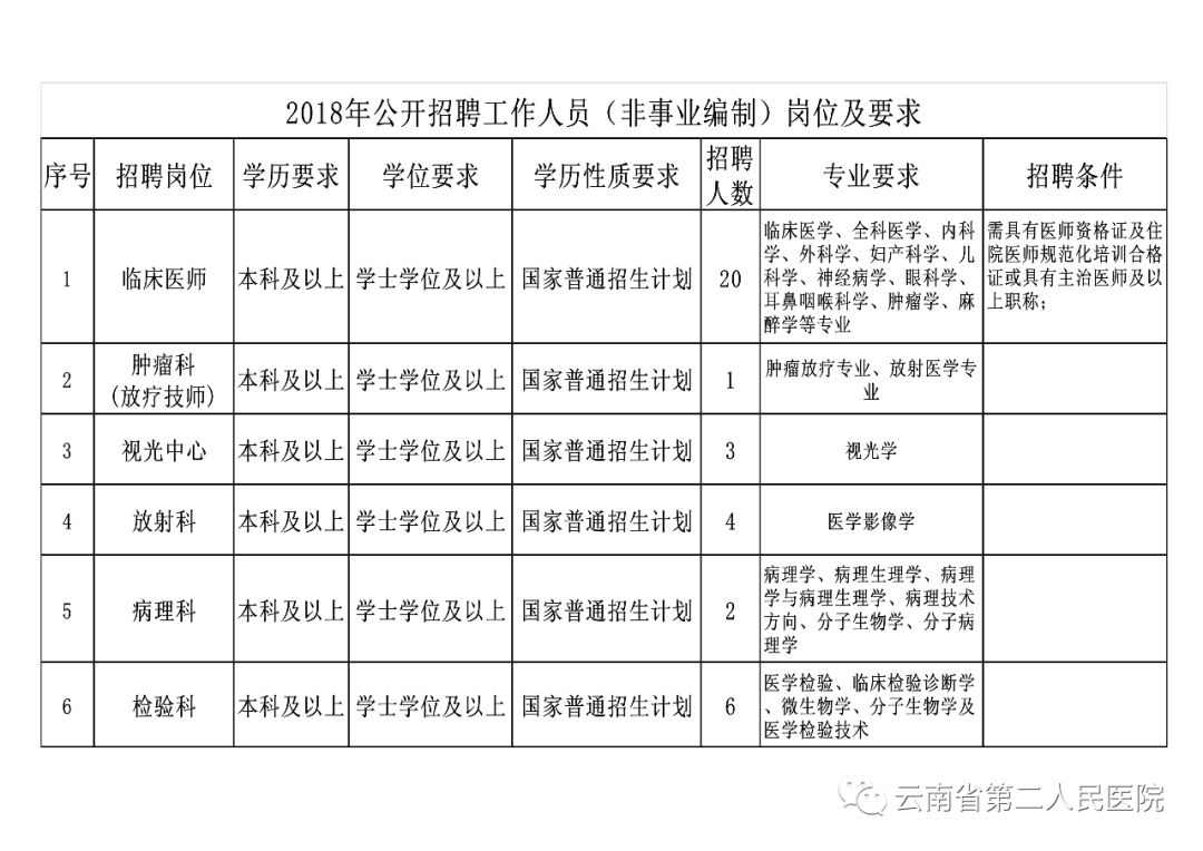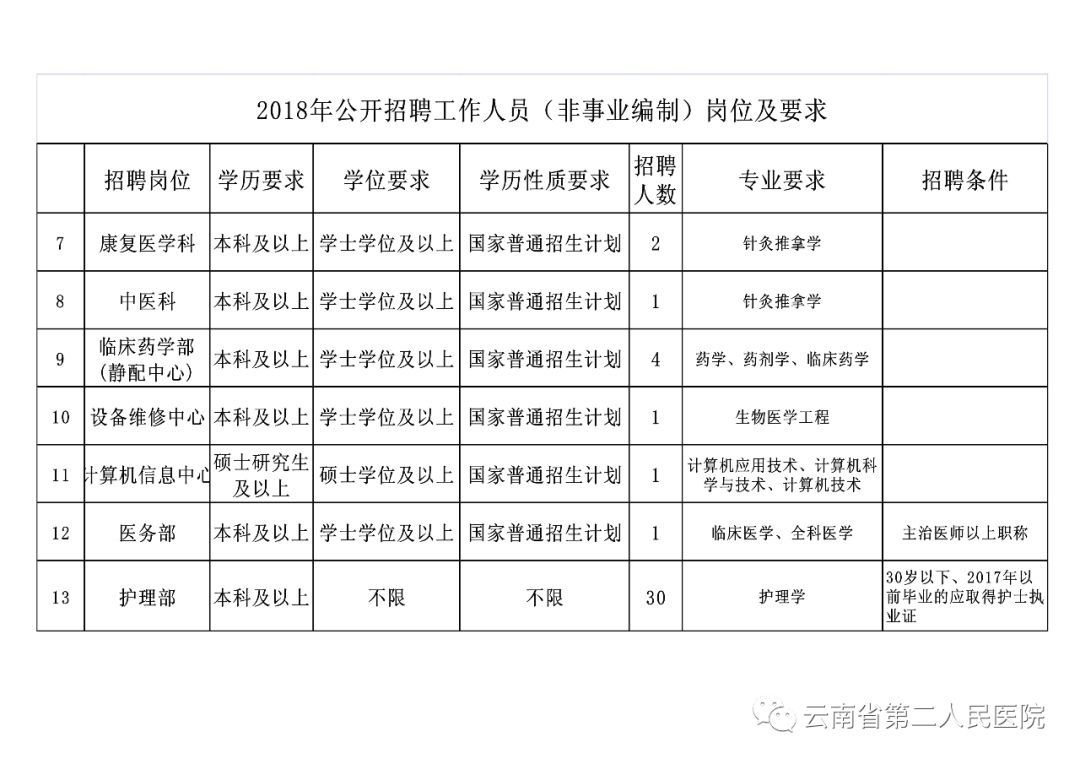 詳見云南省第二人民醫(yī)院2018年公開招聘編制外工作人員崗位及條件(附表)。