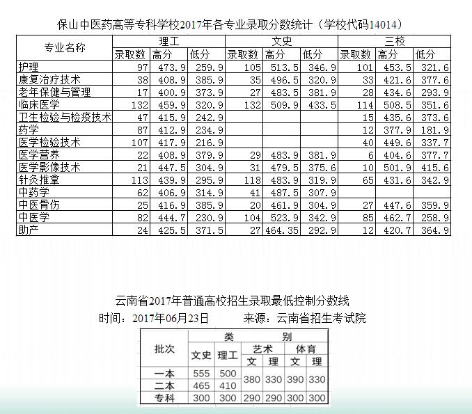 保山中醫(yī)藥高等專科學校2017年各專業(yè)錄取分數(shù)統(tǒng)計