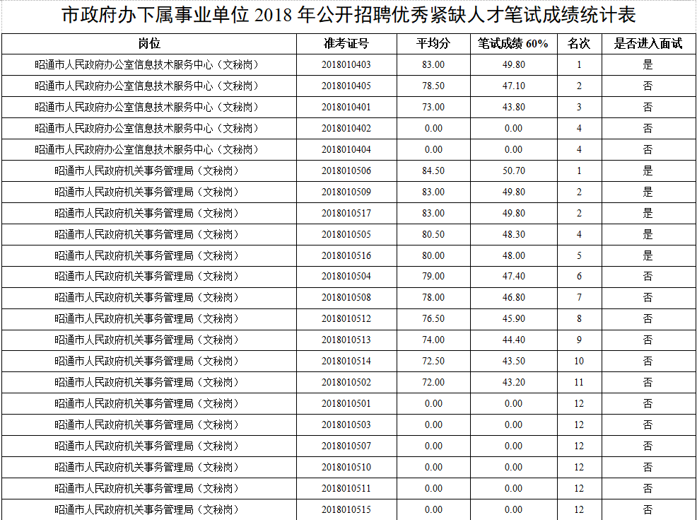 一、筆試成績詳見附件。按照《昭通市人民政府辦公室關(guān)于下屬事業(yè)單位2018年公開招聘優(yōu)秀緊缺人才通告》精神,筆試成績最低控制分?jǐn)?shù)線為80分。低于最低控制分?jǐn)?shù)線80分以下的不進入面試。