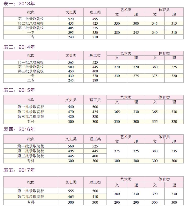 2013-2017年云南省普通高校招生錄取最低控制分?jǐn)?shù)線