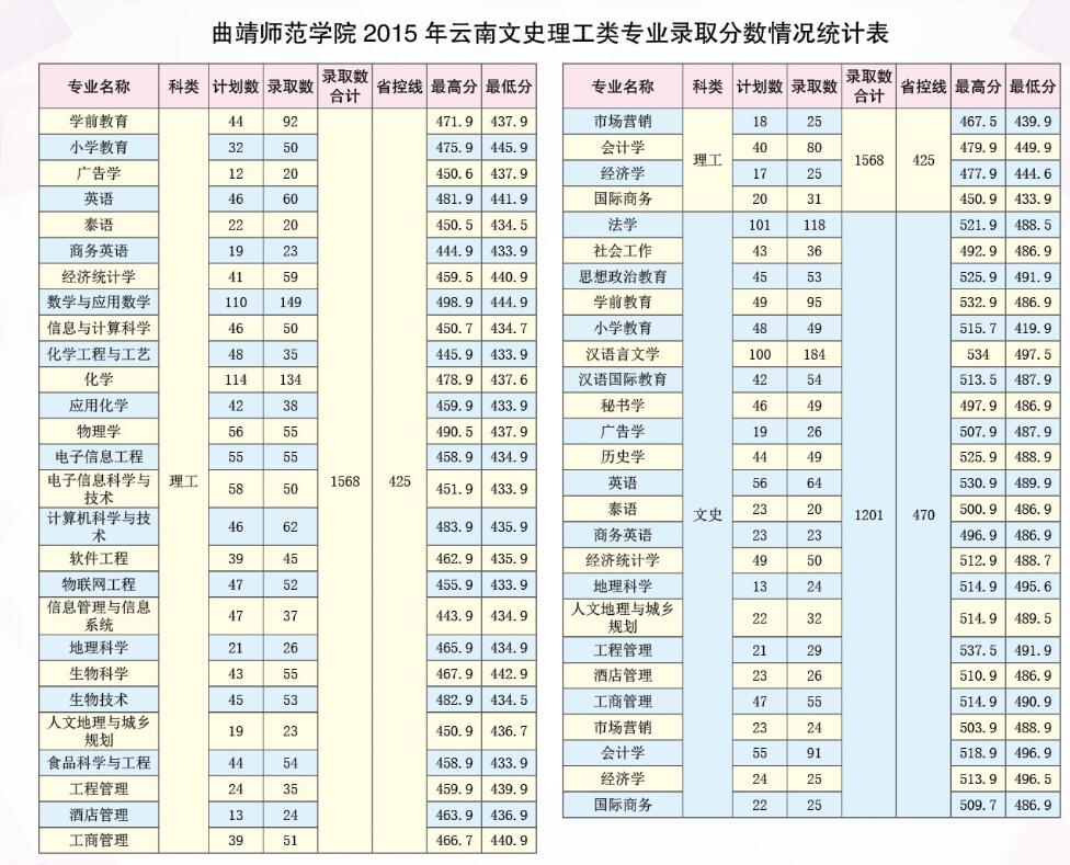 曲靖師范學院2015年云南文史理工類專業(yè)錄取分數(shù)情況統(tǒng)計表
