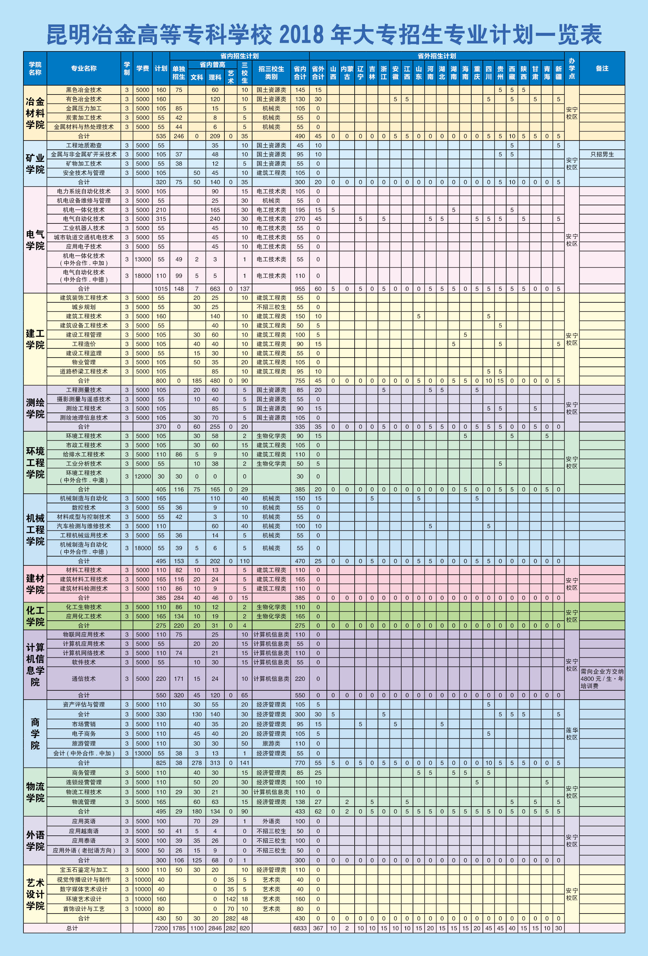 昆明冶金高等專科學(xué)校2018年大專招生專業(yè)計劃一覽表