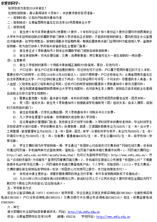 西南林業(yè)大學(xué)2018年專升本入學(xué)須知