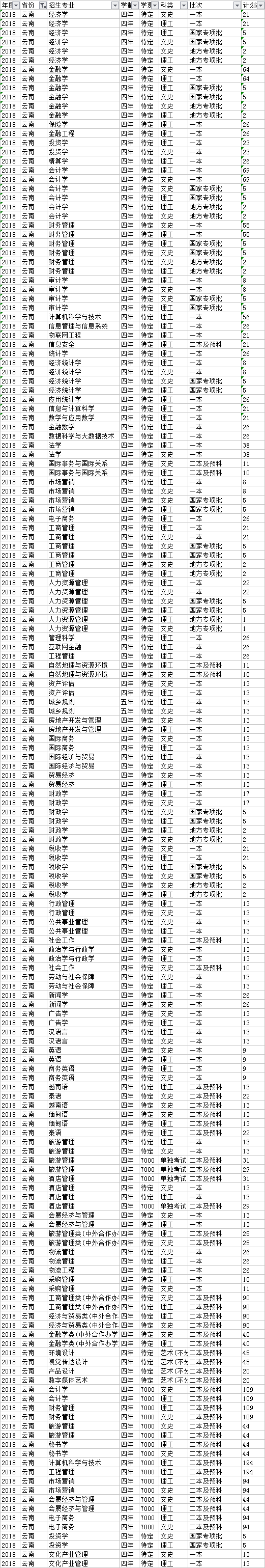 云南財(cái)經(jīng)大學(xué)2018年本科分省招生計(jì)劃表(云南省)