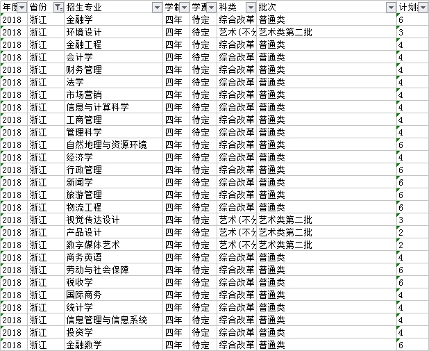 云南財經(jīng)大學(xué)2018年本科分省招生計劃表(浙江)