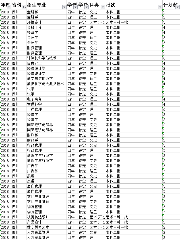 云南財經(jīng)大學2018年本科分省招生計劃表(四川)