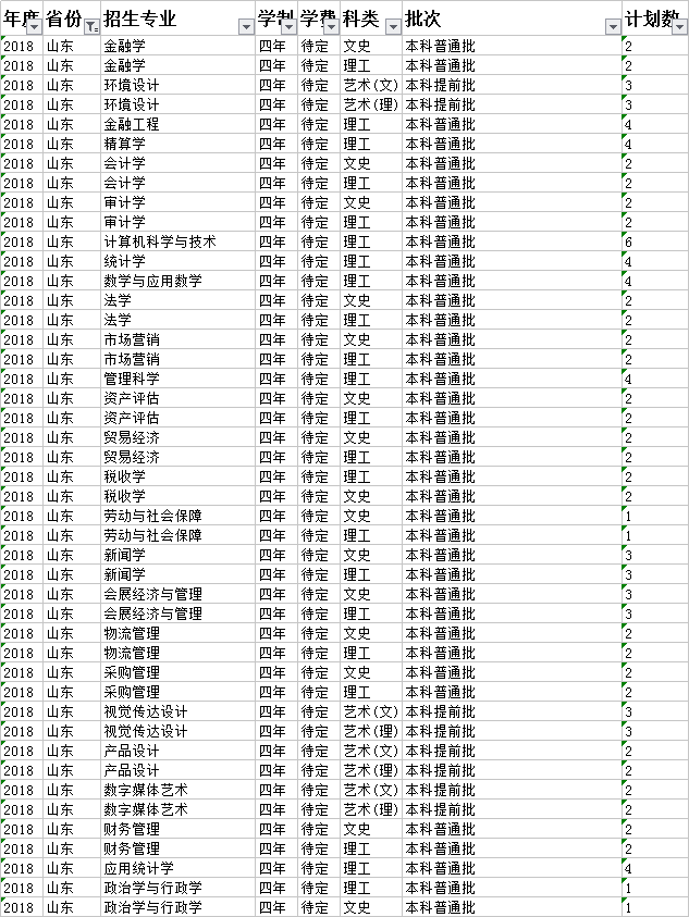 云南財經(jīng)大學2018年本科分省招生計劃表(山東)