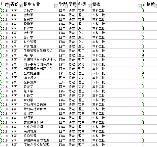 云南財經(jīng)大學2018年本科分省招生計劃表(河南)