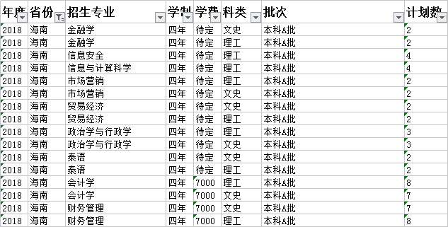 云南財(cái)經(jīng)大學(xué)2018年本科分省招生計(jì)劃表(海南)