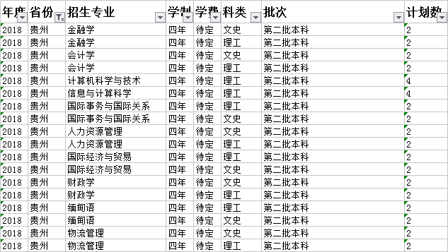云南財經(jīng)大學(xué)2018年本科分省招生計劃表(貴州)